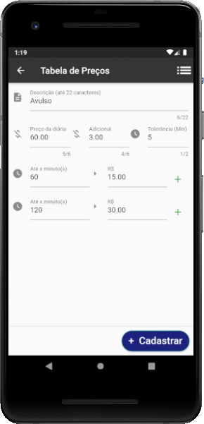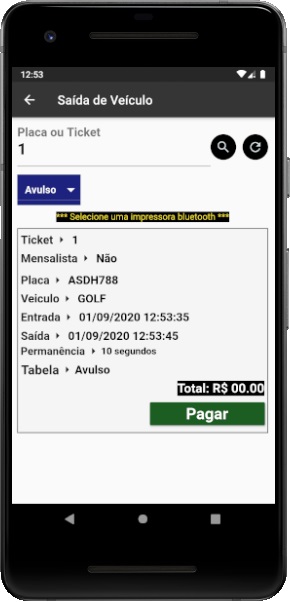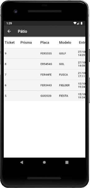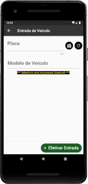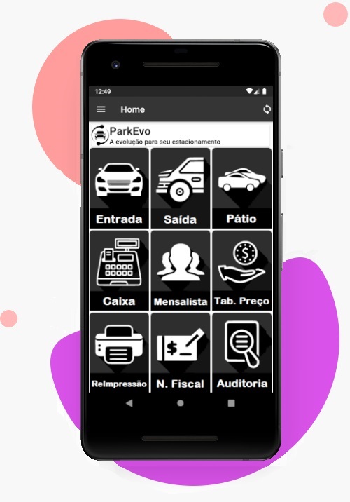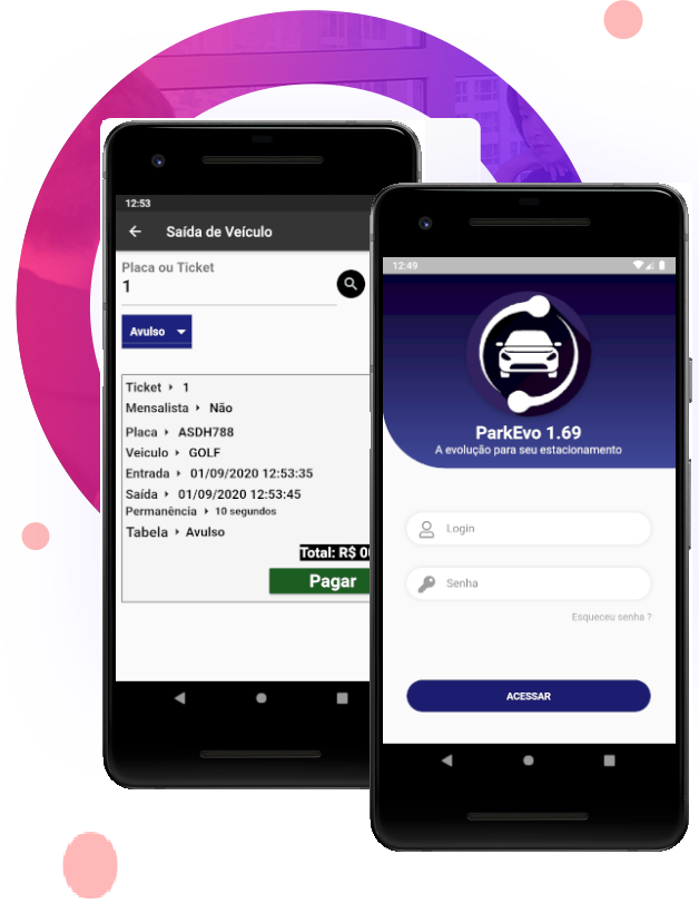 Ao lado temos algumas das principais telas do app, onde evidenciamos a forma simplificada de entrada e saída de veículo, a entrada poderá ser feita utilizando a placa ou prisma (caso habilitado em configuração geral).
